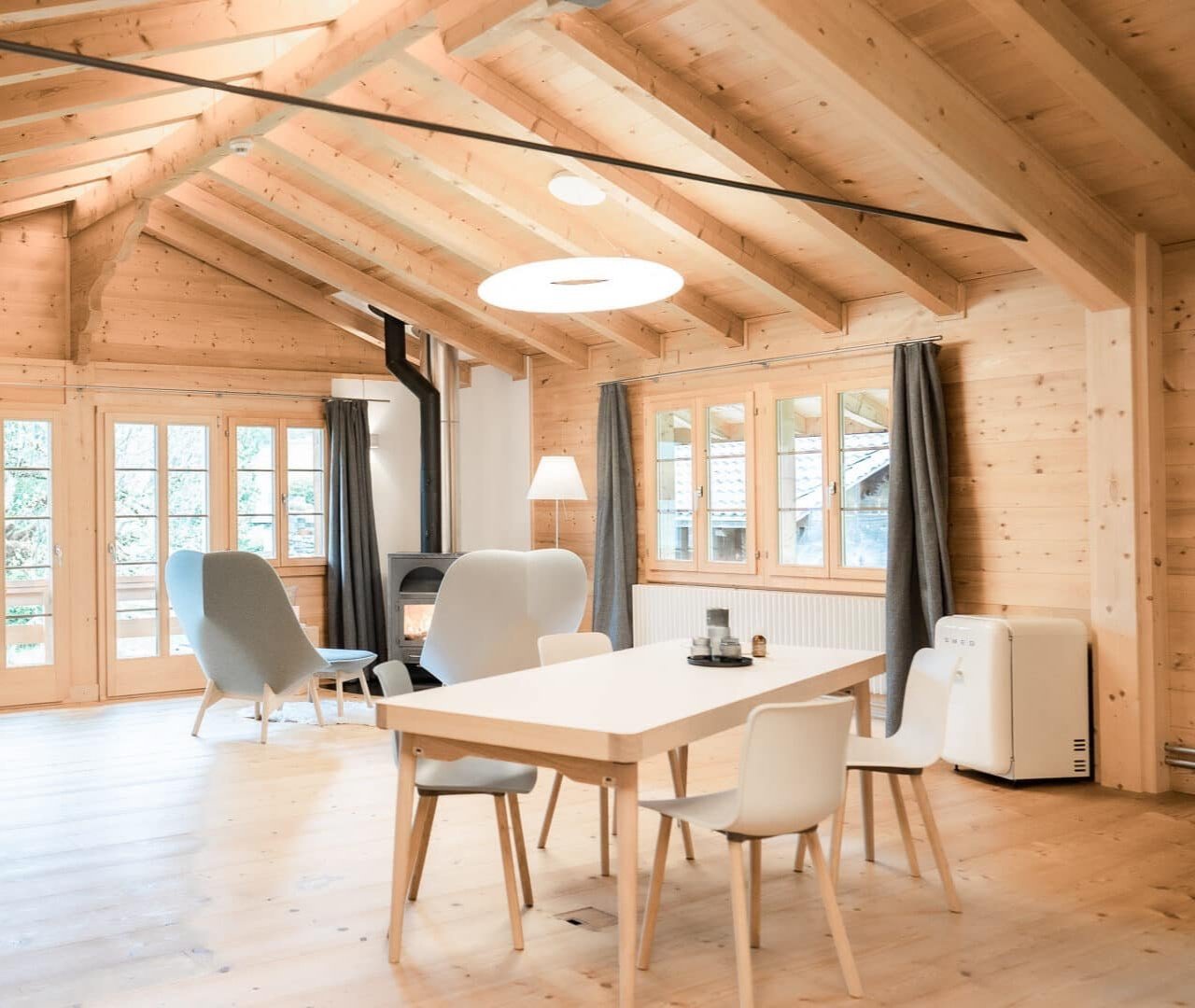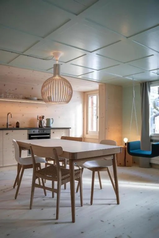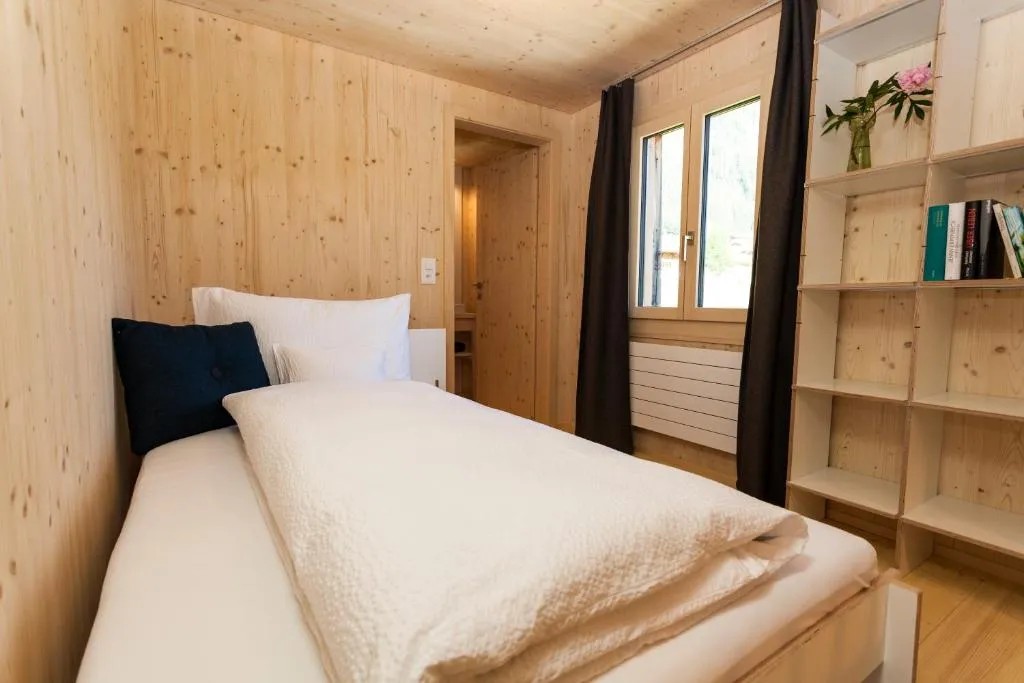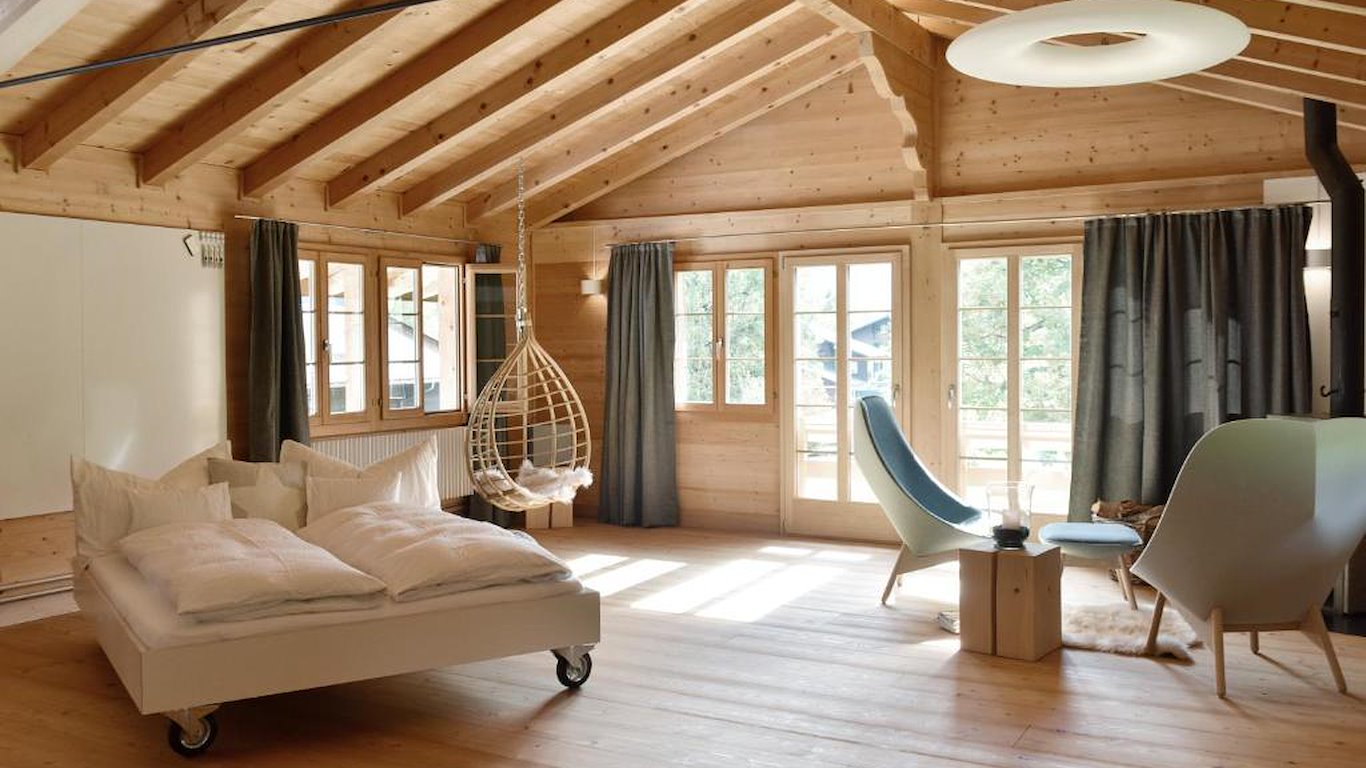 Das Gebäude ist ein renoviertes, historisches Chalet, das bewusst schlicht und reduziert eingerichtet wurde. Die Lodge bietet verschiedene Zimmerkategorien – vom Einzelzimmer bis zu Apartments mit Küche oder Balkon. Alle Unterkünfte sind hochwertig ausgestattet und kombinieren alpine Materialien wie Holz mit modernem Design.