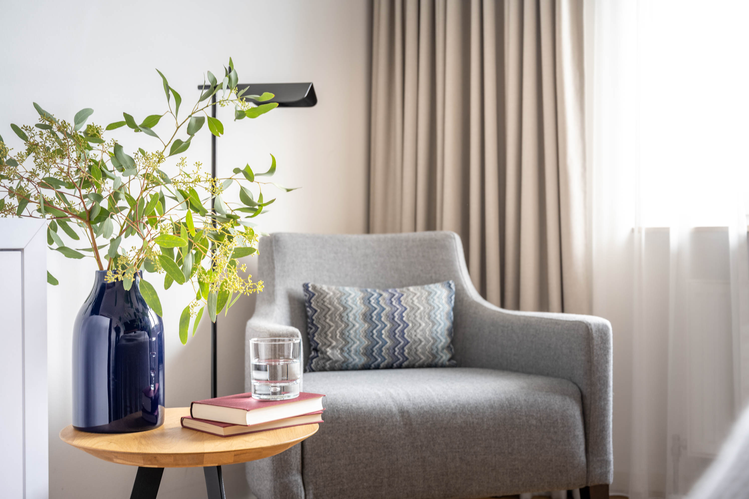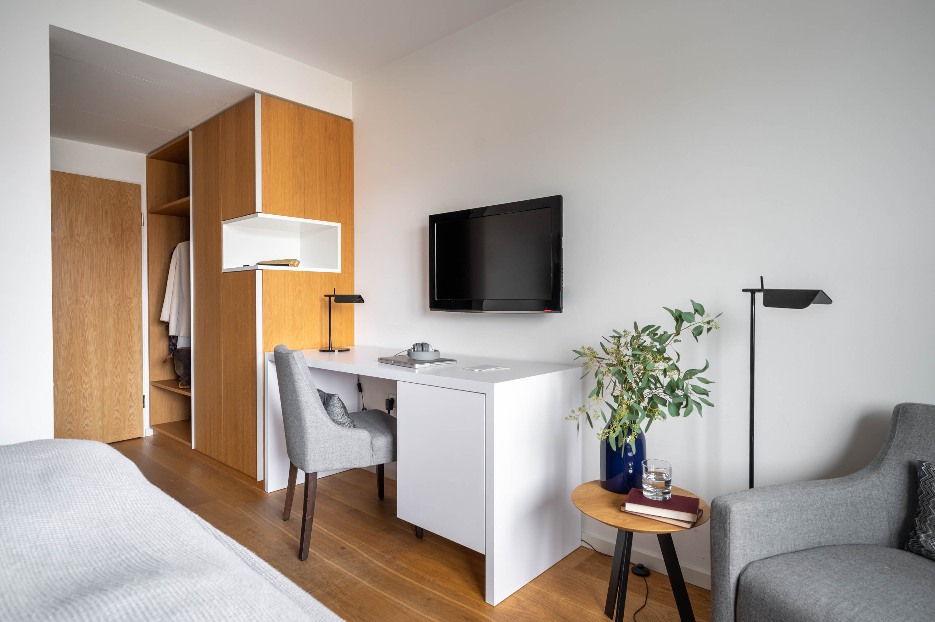 No booking requests by phoneOur deluxe rooms are located in the courtyard house, facing south. The design is a combination of wood, glass, concrete and selected textiles. New urban living with a lot of attention to detail. The 200 cm wide box spring bed faces south to the large window front. A cozy day bed and a wonderful Prostoria armchair are there to relax.