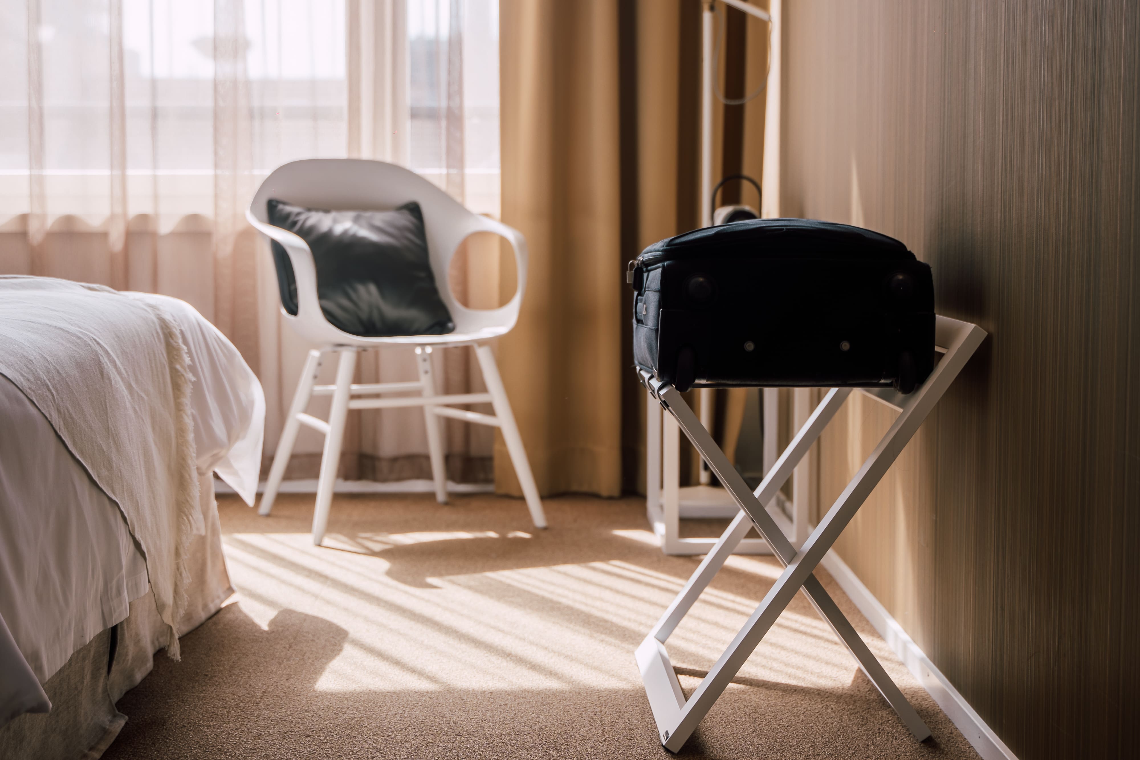 Design room with 1.20m - 1.40m wide quality bed and a view of the unique play of light in the historic industrial hall (windows cannot be opened for security reasons) The room has a desk and laptop safe, mineral water on arrival and mobile check-in / out as well as 24-hour reception and the Trafo Market which offers hot and cold drinks, snacks, sandwiches and salads.
